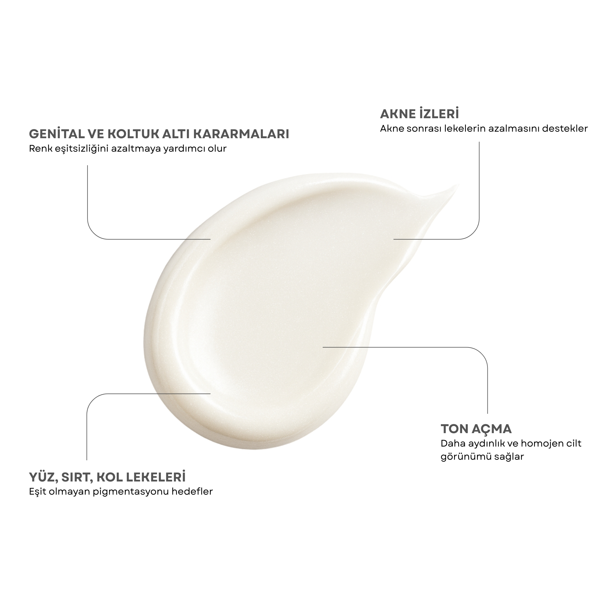 Genital bölge, dirsek, boyun gibi bölgelerdeki kararmalar, güneş ve akne lekeleri ile sırt ve kollardaki lekelenmeler, kaşıntılı durumlar sonrasında kalan izler, yüz ve vücut bölgesinde ton açma gibi durumlara karşı etkili bir bakım sunar. Cilt tonunu dengelemeye yönelik özel formülü, cildinize daha aydınlık ve pürüzsüz bir görünüm kazandırır.